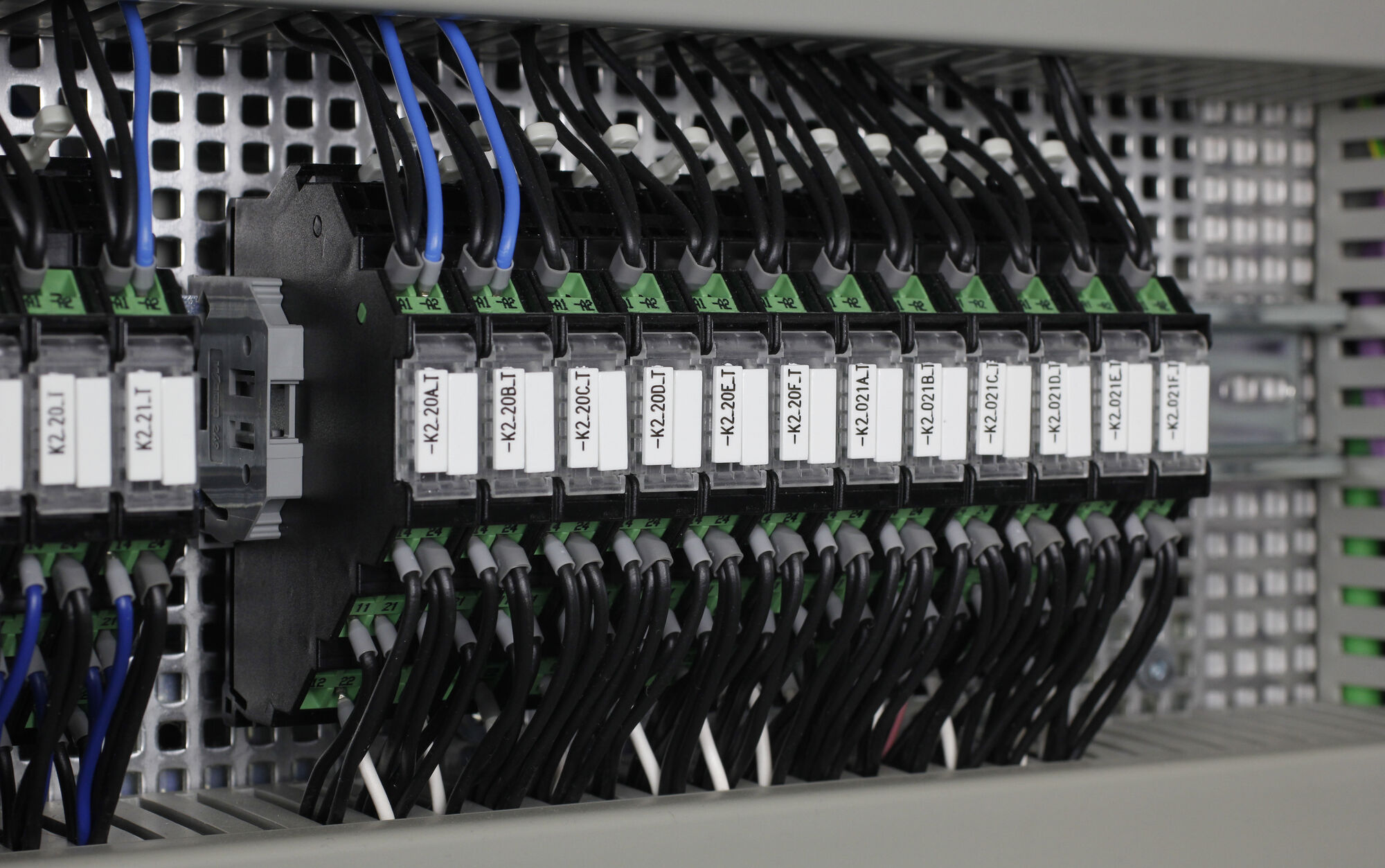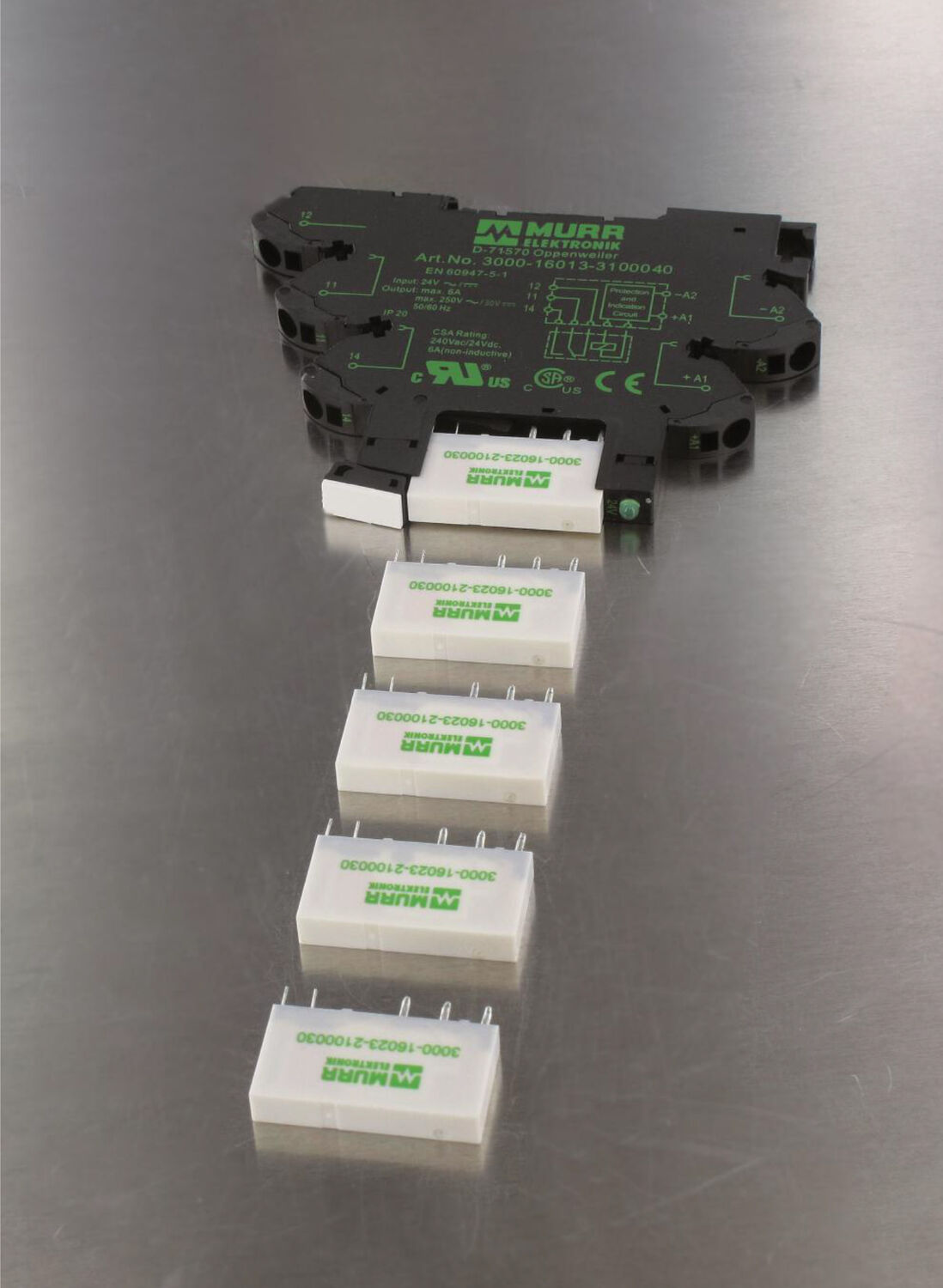 Relays from Murrelektronik are extremely small but perform the best. Integrated LEDs always show the current switching status. Several labels keep the cabinet organized during operation. Relay modules with pluggable relay components are excellent for applications that switch frequently: When the switching component is worn out it can be replaced without any wiring efforts.